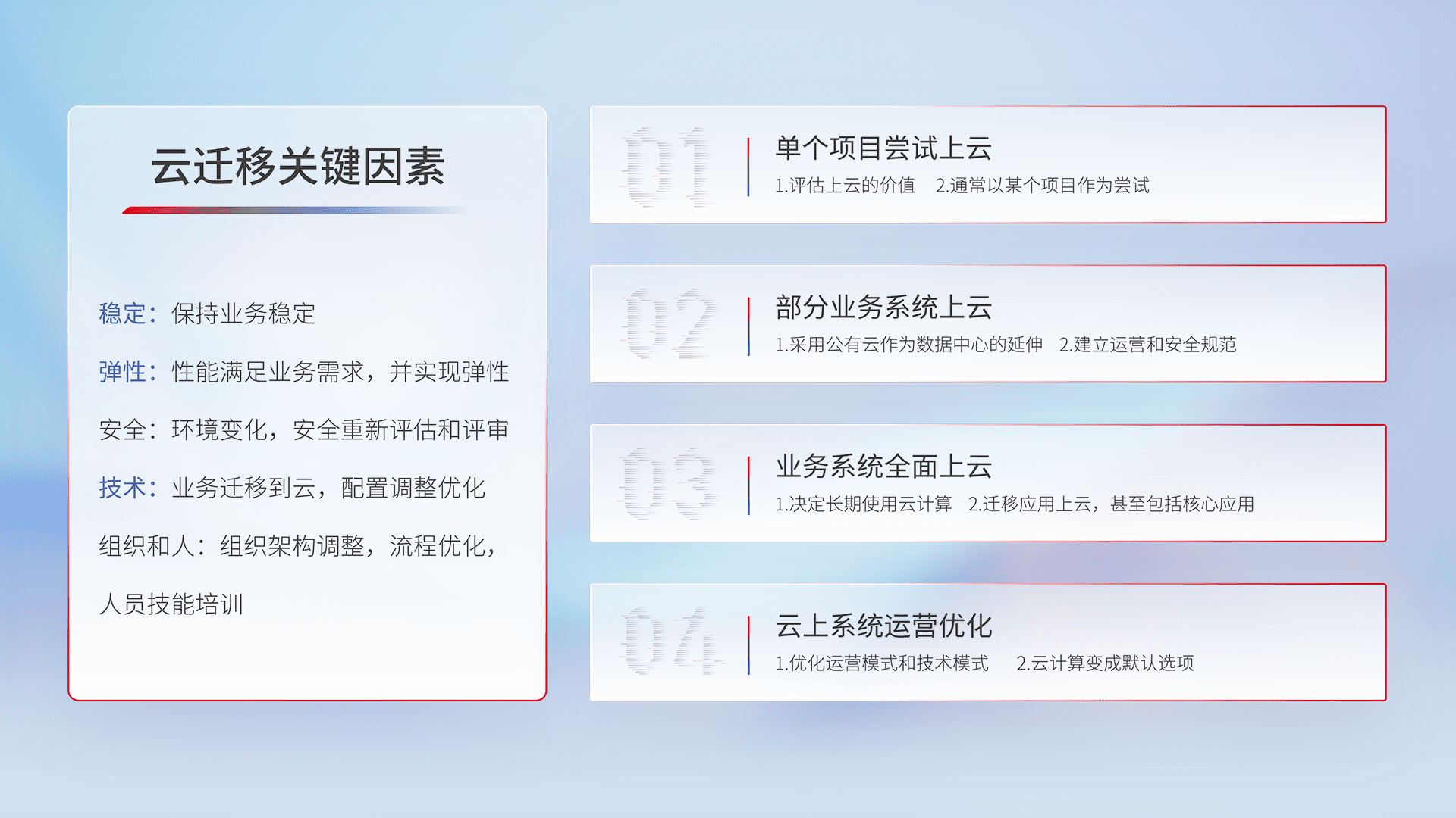 结合实际业务,,,从规划设计、、、、云平台选型、、、云原生改造、、、数据迁移、、集成交付,,迁移全过程为客户识别最佳上云路径,,,,做好风险识别管理,,设计网络架构、、身份权限、、、、安全审计合规、、操作审计、、、、日志审计、、、监控告警策略、、多站点容灾设计等,,对云上基础设施进行整体规划,,,提升IT治理水平,,,,以满足弹性、、、高可用、、、、高性能的需求。。。
