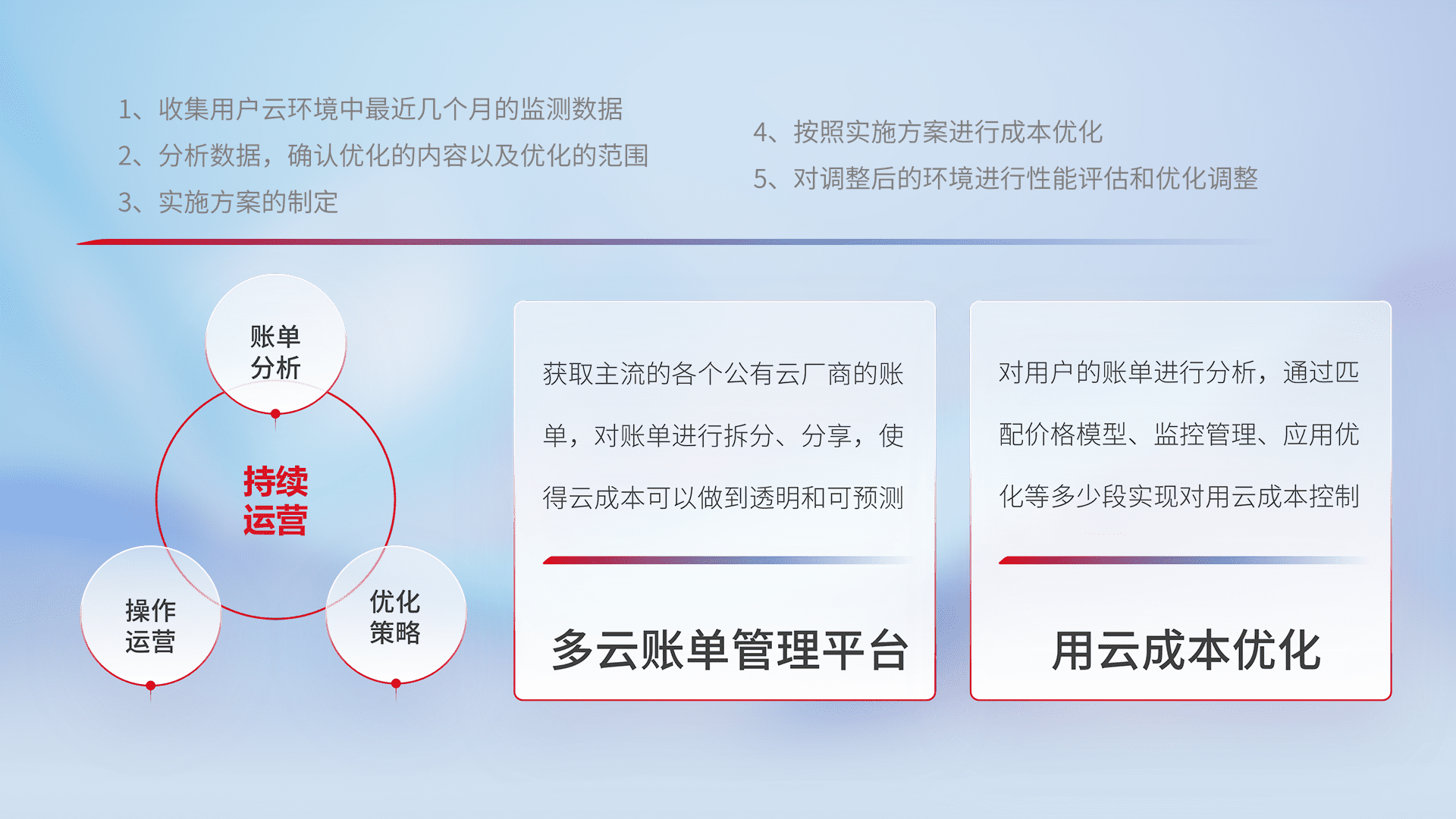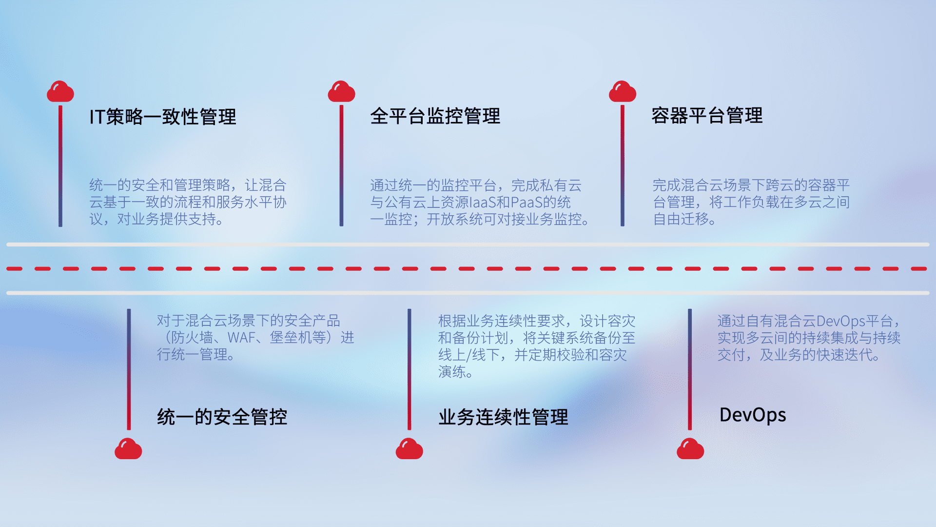 通过多云纳管,,以统一的资源数据模型把客户的云资源进行抽象和封装,,,进而实现对多云资源的统一操作,,,,保障云资源管理的可靠性、、稳定性与可用性。。。量身定制化运维内容,,,配置、、、、开发运维、、补丁管理、、备份、、、监控、、、认证和访问管理、、、、审计和日常巡检等,,,,保障在用云过程中的可靠度,,,,稳定度以及高可用率。。